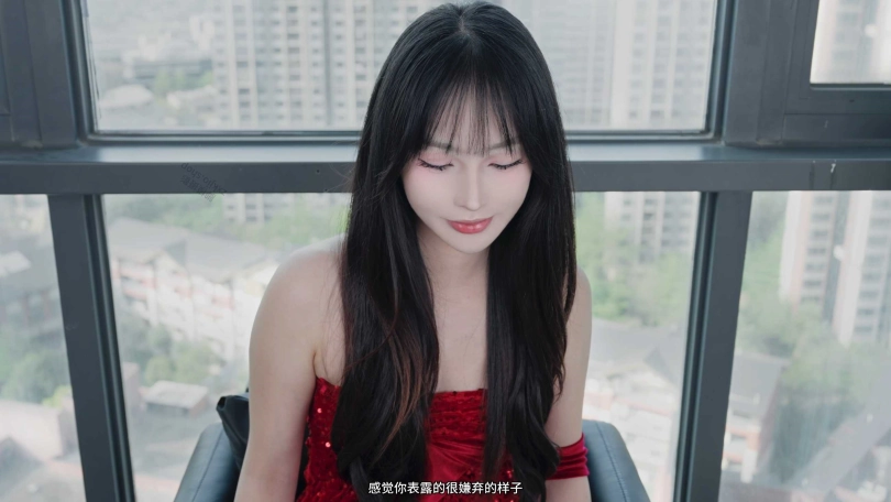 脚上穿着性感的涞觅黑绷带丝袜和长靴,跟我们说她是第一次体验这种。